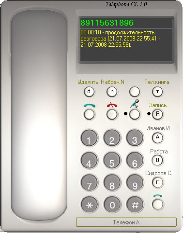 Программа интеллектуального двухканального телефона на голосовом dial-up модеме и телефонной линии. Телефонная книга; быстрый набор; список набранных номеров; возможность записывать разговоры в wav-файлы как в автоматическом, так и ручном режиме; Автоответчик (воспроизведение заданного файла, голосовое воспроизведение в линию подготовленного текста); Автонабор ряда заданных номеров по порядку с воспроизведением в линию файла и текста; расписание Автонабора по дням недели и числам месяца; ведение подробного log-файла отчёта и статистики соединений (время звонка и его продолжительность).