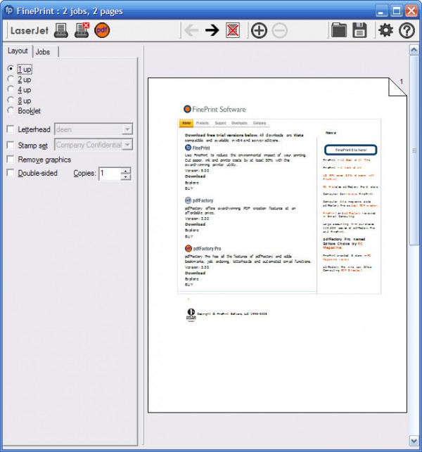 FinePrint - программа для расширения возможностей печати любых принтеров. После установки программы, вы сможете печатать несколько страниц на одном листе, создавать фирменные бланки, печать брошюр, использование водных знаков. FinePrint умеет сохранять страницы в JPEG, TIFF и текстовом формате.