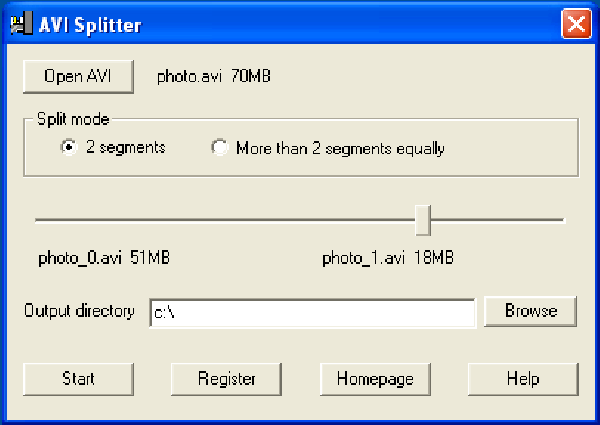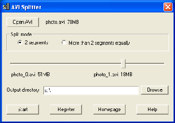 AVI Splitter – программа для вырезать/отрезания/разделить одного AVI файла на несколько более мелких. Поскольку программа не проводит повторного сжатия avi файлов, в результате нет аудио и видео потерь качества avi файла. А скорость перекодирования очень высокая.