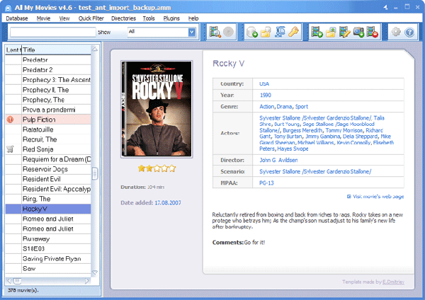 простой импорт информации о фильме из интернет базы данных IMDb.com, а также с русских интернет баз videoguide.ru, film.ru, KinoPoisk.ru и RMDb.ru. Число поддерживаемых программой баз постоянно растёт за счёт подключаемых плагинов.