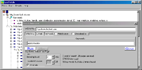 LeoFetch - программа для отображения параметров веб-страниц, загруженных в браузере. Отображает список ссылок, email-адресов, ключевые слова. Практически программа может пригодится для составления карты сайта для Google, проверки правильности ссылок на сайте, скачивания файлов сайта на компьютер.