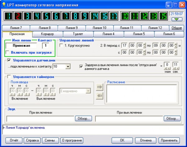 Программа, использующая LPT-порт для выборочного включения / выключения до 12 сетевых электроприборов. Линии могут включаться / выключаться тремя способами: вручную, нажатием линейных кнопок панели индикации; автоматически при срабатывании заданных датчиков; автоматически по таймеру (расписанию). Датчиками могут служить любые приборы, которые в дежурном режиме имеют на выходе разомкнутый контакт, а при срабатывании - замкнутый. Для работы программы необходимо иметь соответствующий разъём для подключения к LPT и собрать несложную схему блока управления внешними устройствами.