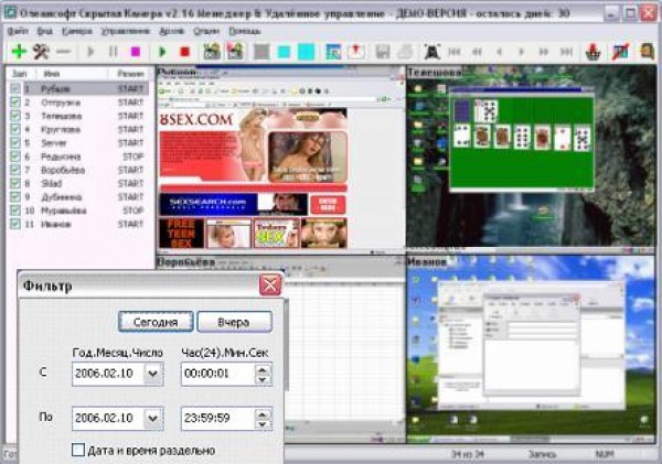 Программа Скрытая Камера предназначена для удалённого управления, прослушифание через микрофоны, одновременного наблюдения за помещениями и за компьютерами служащих в локальной сети или через Интернет с записью или без записи информации в архив.