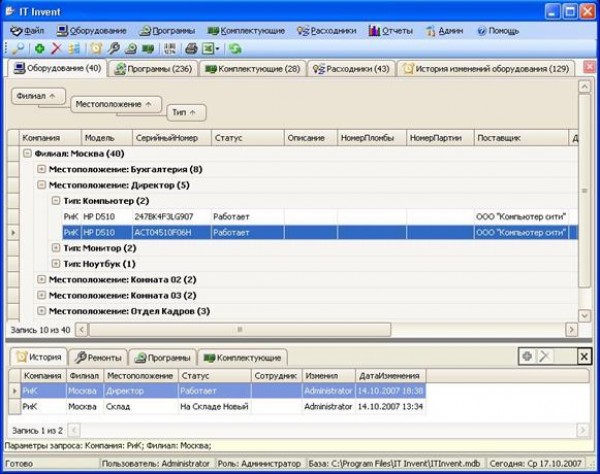 Программа IT Invent позволяет вести инвентаризационный учет компьютеров, IT оборудования, программного обеспечения, комплектующих и расходных материалов. Учет ведется в рамках организаций и их филиалов. Программа поможет администраторам, сотрудникам IT отделов и их руководителям, владельцам компьютерных магазинов, заведующим складов и всем людям которым необходимо иметь четкую и актуальную картину состояния парка IT инфраструктуры.