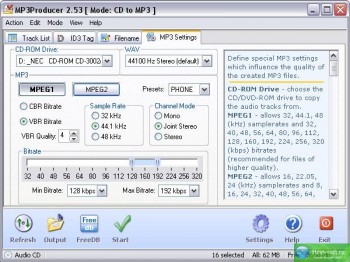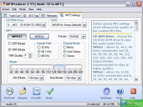 MP3Producer - программа, копирующая треки с аудио CD и кодирующая их в MP3, OGG, WMA, WAV форматы. Программа может работать в одном из режимов: СD в MP3, CD в WAV, CD в OGG, CD в WMA, WAV в MP3, WAV в OGG, WAV в WMA, OGG в WAV, WMA в WAV. MP3Producer поддерживает FreeDB (СDDB), что дает Вам возможность легко найти информацию об интересующем Вас альбоме (названия песен, имя исполнителя, название альбома, год выпуска альбома и т.д.) в Интернете. Использование ID3v1 и ID3v2 тага позволяет Вам сохранять полученную информацию о песне в MP3, OGG, WMA файле. MP3Producer поддерживает различные форматы MP3 (MPEG1 и MPEG2), все битрейты (8-320 кбит/сек, постоянные и переменные). C помощью функции Копировать сегмент CD можно прослушать и скопировать в отдельный WAV, MP3, WMA, OGG файл любую часть СD. Причем, это может быть как часть одного трека, так и несколько треков вместе. В MP3Producer предусмотрена также и возможность гибкого создания форматов для названий файлов, директорий, плейлистов, используя информацию из ID3 тагов. MP3Producer имеет приятный и удобный интерфейс, с которым будет не сложно разобраться даже новичку! Программа бесплатна для русскоязычных пользователей! Приятного использования!