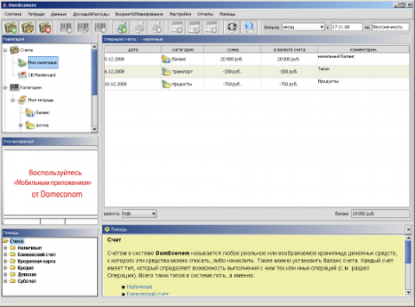 Вы часто задаетесь вопросом, куда делись Ваши деньги? Почему при неплохой зарплате Вам едва хватает денег «до получки»? Вы не можете убедить домочадцев, что расходы на Ваш любимый компьютер – малая толика в общем семейном бюджете, или, наоборот, расходы на продукты – немаленькая сумма? Было бы удобно посмотреть информацию о Ваших тратах за месяц? И не только по операциям, как в банковской выписке, но и данные по типам расходов (расходы на еду, спорт, обслуживание долга)? Попробуйте управлять Вашими финансами с DomEconom.