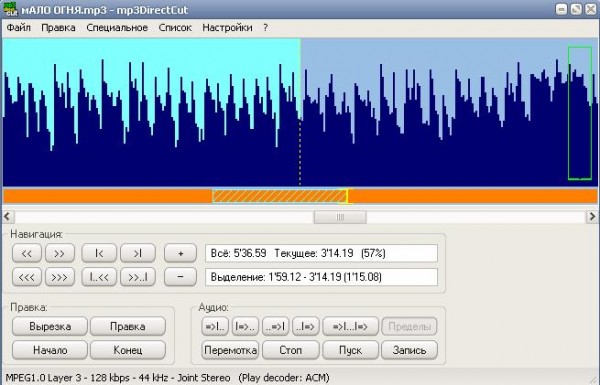 mp3DirectCut - небольшой редактор MP3 файлов, позволяющий вырезать или копировать части файлов непосредственно, без декомпрессии в формат PCM. Вновь полученные файлы сохраняются без потери качества. Позволяет обрезать тишину в начале и/или конце файла, нормализировать звук, а также плавно убирать его в конце композиции, обьединять файлы, редактировать ID3-тэги и записывать Mp3 непосредственно на диск.