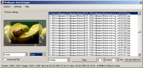 * Подготовленные в соответствии с настройками картинки и миниатюры могут быть сохранены в кэше программы. Это позволяет не производить операции по обрезке изображения каждый раз при смене обоев, благодаря чему смена происходит несколько быстрее. На высокопроизводительных машинах разница может быть незначительной. При большом количестве обоев размер кэша может достигнуть приличных размеров, так как готовые обои храняться в формате BMP, обеспечивающем максимальную совместимость.