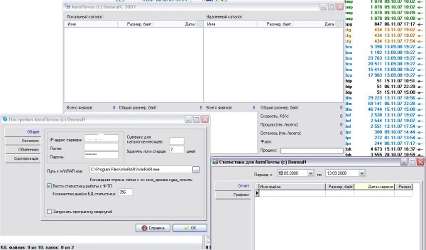 Программа для автоматической загрузки файлов на ФТП-сервер и закачки с него. Используется в организации как альтернатива электронной почте. Ваозможность гибкой настройки локальных и удаленных каталогов, распаковка полученных архивов, ведение статистики с различными вариантами сортировки и построением диаграмм, гибкий сортировщик полученной почты.