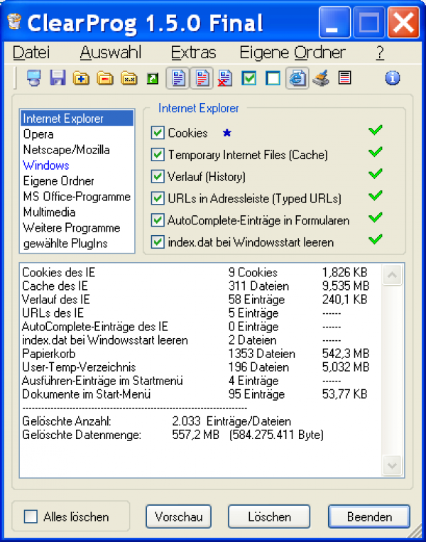 ClearProg предназначена для читки cookies, кеша браузеров, истории, списка закачек браузерах Internet Explorer, Opera, Netscape и Mozilla; очистки корзины, папки TEMP, списка документов, а также других программ: Acrobat, GetRight, Wordpad, OpenOffice, Google Toolbar, WinZip и PowerArchiver. И все это не учитывая плагинов, которые возможно добавить и тем самым расширить возможности этой программы