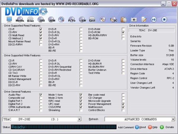 Так же DVDInfoPro позволит вам производить тест самих накопителей на целостность информации и поверхности диска. Плюс ко всему может произвести быстрое форматирование всех видов CD, включая современные Blue-ray и HD.