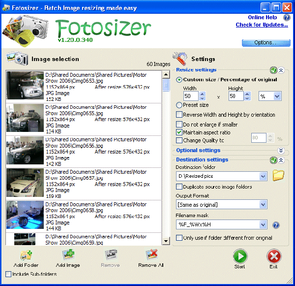 Fotosizer, как ясно из названия, предназначен для изменения размеров изображения. Изменение происходит очень быстро и просто: выбираем фото, задаем новые размеры и нажимаем кнопку. Все до безобразия просто.