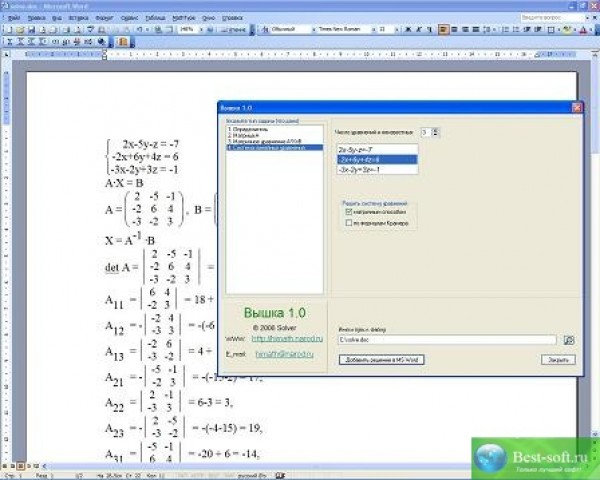 Программа предназначена для получения решения некоторых математических задач из области линейной алгебры. Программа формирует не только ответ решения, но и само решение (последовательность математических действий) и помещает его в MS Word. Программа может быть использована студентами. Возможности: Вычисление определителя порядка n; Вычисление матрицы, обратной матрице размеров n x n; Решение матричного уравнения A*B=X, A(n x n), B(n x m); Решение системы n линейных неоднородных уравнений с n-мя неизвестными: 1) матричным способом; 2) по формулам Крамера; n = 2…4, m = 1...n.