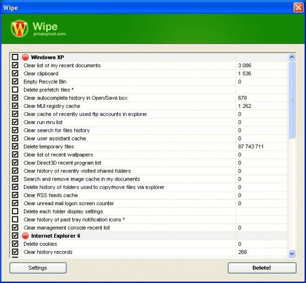 WIPE стирает историю браузера, index dat, кукис, логи, кеш, и т.д. Подобная программа полезла в тех случаях, когда вам необходимо сохранить секретность вашего пребывания в Интернет.