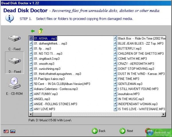 Dead Disk Doctor – позволяет копировать файлы с поцарапанных или поврежденных CD, DVD дисков, нечитаемых Флоппи и Жестких дисков или других носителей. Dead Disk Doctor читает блок, за блоком изменяя его размер для увеличения вероятности прочтения, собирает файл, который был поврежден. Потерянные участки заменяет случайными данными. Выпускается в бесплатной и плюс версии. Программа читает файл блоками по 4-16кб и когда устройство (CD-ROM, например) выдает ошибку, размер блока уменьшается в два раза, попытка повторяется, и так до тех пор, пока блок данных не будет прочитан без ошибок. Если размер блока достигает минимума зависящего от файловой системы, тогда программа заменяет один блок случайными данными и начинает чтение со следующего. После удачного прочтения, размер блока увеличивается в два раза и так далее пока не достигнет максимума.