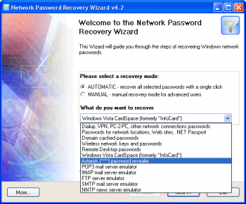 Network Password Recovery Wizard – программа, которая поможет вам восстановить сетевые пароли Windows. Эта программа является универсальным средством, так как имеет огромное количество поддерживаемых возможностей дешифрования.