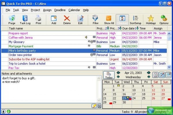 Quick To-Do PRO поможет Вам организовать ваши дела быстро и удобно! Программа позволяет организовать список задач, с разбивкой по проектам и людям, ответственным за конкретную задачу, дневник, удобная система будильников и напоминаний о праздниках и днях рождения, а так же много других полезных функций. Кроме того, защита паролем позволит скрыть Ваши данные от посторонних глаз. Программа имеет гибко настраиваемый интерфейс. Льготная цена для жителей СНГ.