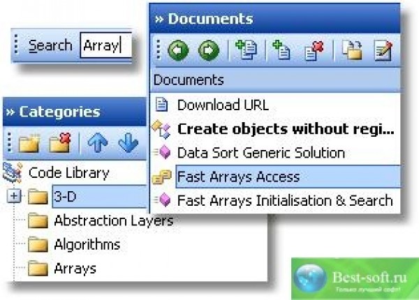Программа для управдения библиотекой исходных кодов. Поддерживает более 30 языков программирования. Реализованна поддержка шифрования базы данных. Программа уже содержит более 10 000 строк кода. Есть функция поиска кода по библиотеке.