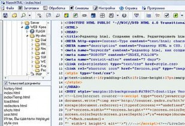 NeonHTML – обладающий визуальным управлением, HTML и CSS редактор. Отличается высокой функциональность и удобством использования. Редактор бесплатный, и поэтому на него стоит обратить внимание начинающим программистам, занимающимся оптимизацией SEO.
