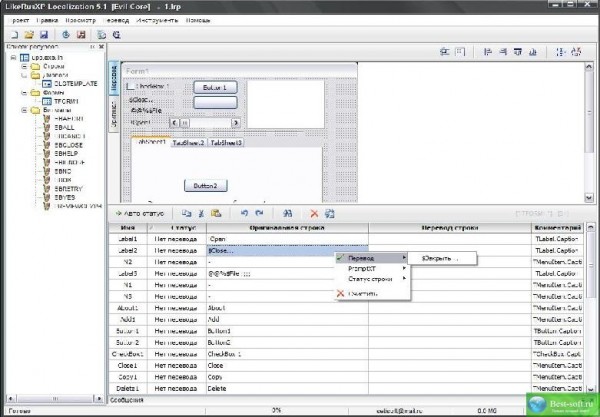 Мощный программный комплекс для локализации (универсальный русификатор) - дает возможность переводить любые (в том числе сжатые и защищенные протектором) программы, библиотеки, а так же другие поддерживаемые форматы файлов с одного языка на другой. Программа имеет все визуальные редакторы: форм, меню, диалогов; совмещенный со средой перевода - редактор для перевода строк зашитых в тело программы; мощную систему глоссариев на основе баз данных; для новичков предусмотрена функция полного авто-перевода; удобный и функциональный менеджер для создания обновлений; Программа поддерживает плагины, поэтому вы сами можете наращивать ее потенциал или пользоваться чужими наработками.