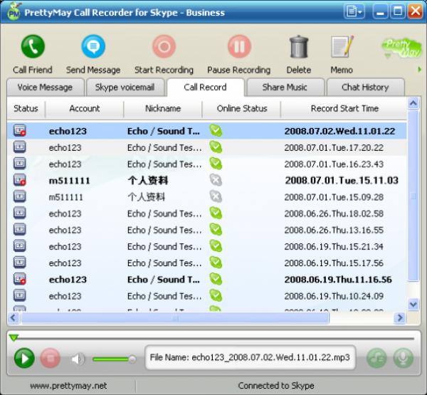 PrettyMay Call Recorder for Skype – это небольшое дополнение к популярному Интернет телефону Skype, для записи разговоров. Программа совместима со Skype 3 версии и выше.
