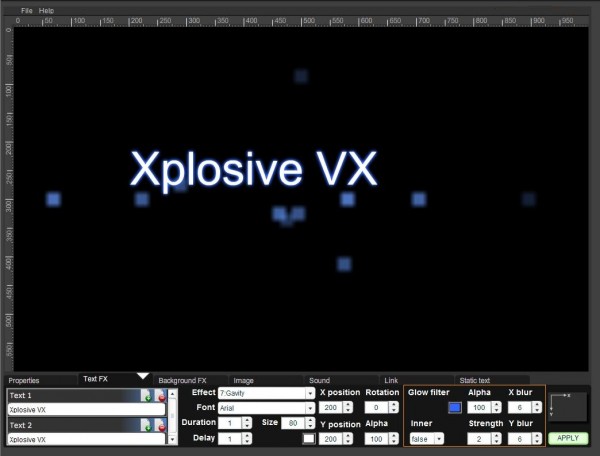 Xplosive VX – идеальное решение, если вы решили добавить Flash-анимацию на ваш веб-сайт или в презентацию PowerPoint. Вы сможете сделать с помощью этой программы всевозможные банеры, интро, кнопки и т.д.