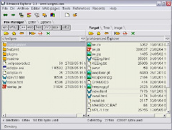 Как и многие другие файловые менеджеры Advanced Explorer имеет двухпанельный интерфейс, который обеспечивает удобную работу. Данная программа имеет в своем распоряжение такие инструменты как просмотрщик картинок, текстовый редактор, дерево каталогов и ZIP-архиватор. Так же есть возможность запускать приложения прямо из под этого файлового менеджера.