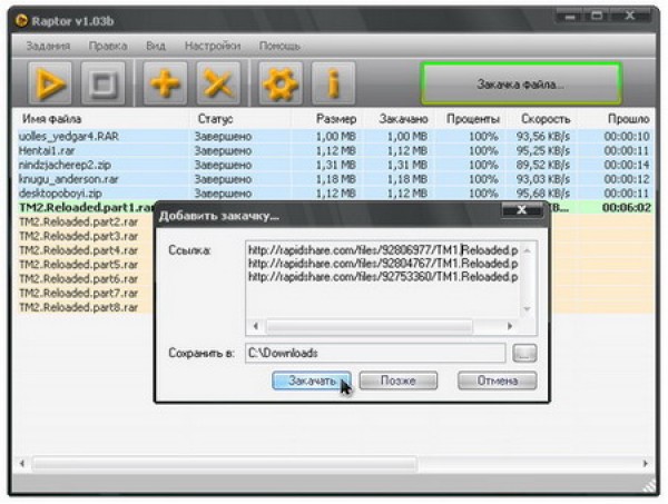 Программа с грозным названием Raptor предназначена для автоматизации закачек с известного файлообменника Rapidshare. С ней вам больше не придется ждать прямых ссылок по несколько минут и скачивать большие файлы частями.