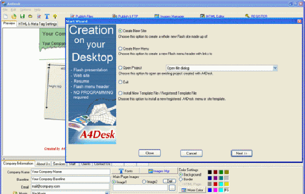 A4Desk – профессиональный инструмент для разработчиков flash сайтов. Вы сможете выполнить как целый сайт, так и различные логотипы, меню и т.д., с помощью этой программы.