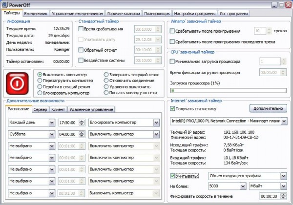 PowerOff - программа для выключения и перезагрузки компьютера по расписанию. Имеет русскоязычный интерфейс и поддержку горячих клавиш.