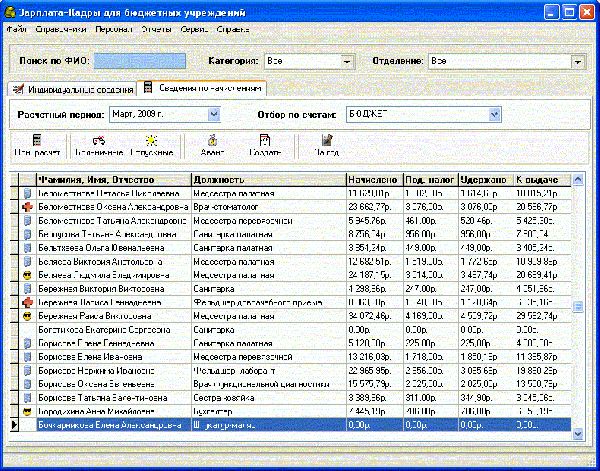 Программа для кадрового учета и расчета заработной платы в бюджетных учреждениях (образовательных, медицинских и других) по ЕТС и новой системе оплаты труда. Простой и удобный интерфейс, автоматический расчет больничных и отпускных, возможность описания в программе произвольных надбавок и выплат, разделение по источникам финансирования(бюджет, ОМС и др.), контроль за выданными денежными средствами, формирование кадровой, бухгалтерской и налоговой отчетности. Также программа позволяет формировать файлы выгрузки для ИФНС и пачки для ПФР. Есть возможность импортировать кадровые данные из 1С: Зарплата+Кадры.