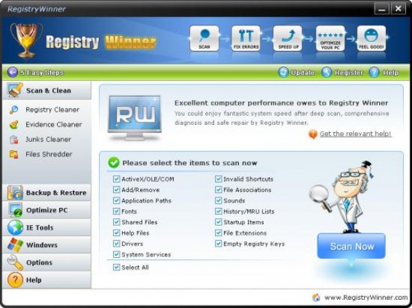 Registry Winner – программа для общей оптимизации и ускорения работы системы. Вам просто нужно выбрать необходимые элементы очистки, нажать кнопку запуска и программа сама найдет и удалит весь мусор, тормозящий работу компьютера.