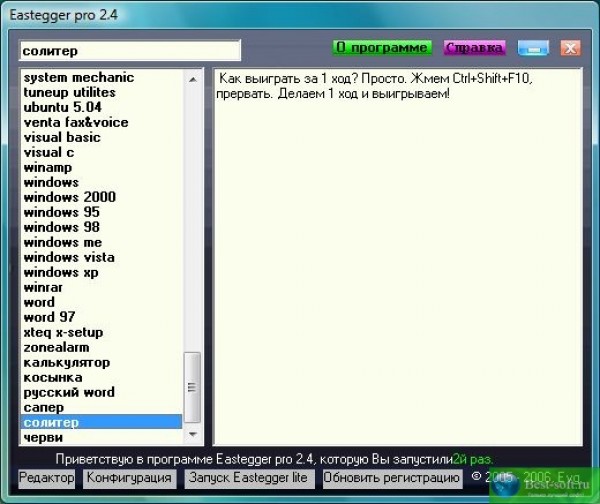 Предлагаю вашему вниманию уникальную программу - базу данных с описаниями пасхальных яиц (скрытых возможностей в программах). Секреты на такие известные операционные системы, программы, мобилки... как adobe illustrator, acrobat reader 4, acdsee 4, corel draw, delphi 6, dreamweaver, easy cd creator, eastegger, excel, flash 4, frontpage 98, fine reader 7, firefox, google, internet explorer, icq, kaspersky antivirus, lingvo, mobile phone alcatel, mobile phone ericsson, mobile phone lg, mobile phone mitsubishi, mobile phone motorola, mobile phone nokia, mobile phone philips, mobile phone sagem, mobile phone samsung, mobile phone siemens, mobile phone sonyericsson, mobile phone standart, notepad, nero, outlook, office xp, paint, palm, paint shop pro, power point, pocket pc, photoshop 7, php, regcleaner 4.1/4.2, ubuntu 5.04, visual basic, visual c, winamp, windows 95, windows 98, windows me, windows 2000, windows xp, windows, winrar, word 97. word, xteq x-setup, zonealarm, 3d mark 99, 3d mark 2001, калькулятор, косынка, сапер, солитер, черви... и многие другие