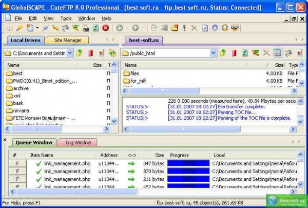 Популярный FTP-клиент. Огромное количество функций. Удобный интерфейс. Поддерживает работу через прокси, защищенное соединение.