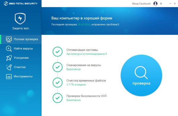 360 Total Security - мощное приложение, главная задача которого очистить ПК от нежелательных угроз и провести оптимизацию компьютера. Программа базируется на работе пяти движков, 4 из которых отвечают за безопасность.