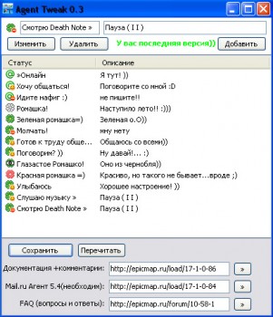 Программа для создания уникальных статусов Mail.Ru Агента. Позволяет создать до 50(!) доп. статусов с икоками даже от статусов Онлайн, ICQ-Онлайн, Отключен и т.п. с любым названием и описанием статуса.