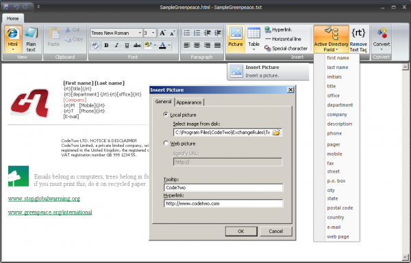 CodeTwo Exchange 2007 – программа для автоматического добавления подписи и отказа на исходящие сообщения, отправленные с помощью Exchange Server 2007. Имеется испытательный период использования.