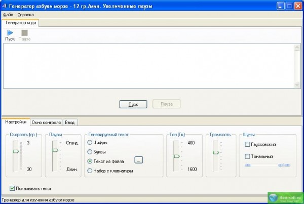 Кто из нас не хотел выучить азбуку Морзе? Даже не знаю. Мне всегда было интересно знать, что там так пищит и т.п. Программа на данном этапе практически готова к реализации. Генерирует код Морзе с изменяемой скоростью, паузами и тоном.. Возможна подгрузка текста из файла, случайная генерация. Есть возможность добавления шумов при прослушивании кодограмм для большей реалистичности.