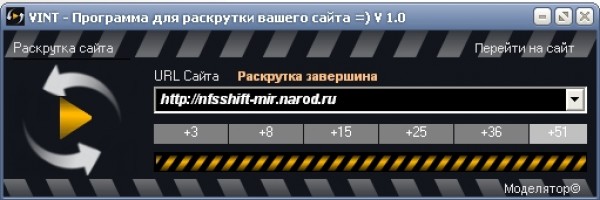 Главным преимуществом этой программы является простота в использовании. Вам всеволишь надо указать URL Вашего сайта, выбрать режим раскрутки (от +3 до + 51), и нажать на кнопку ПУСК. Уже через малое время вы заметите как на ваш сайт начинают прибывать новые посетители. =) Рекомендую