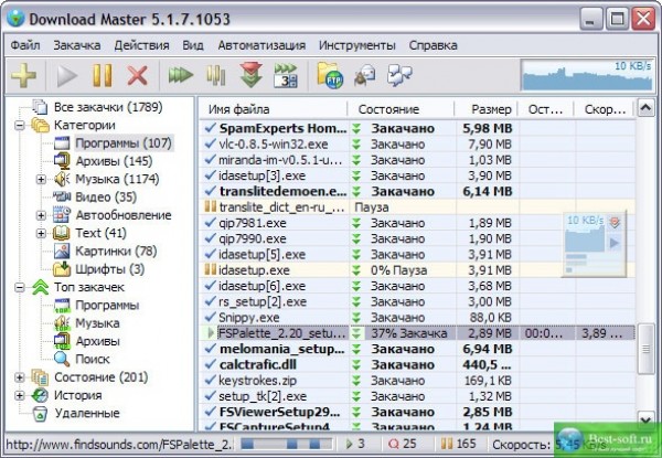 Download Master позволяет значительно повысить скорость закачки файлов через Интернет с использованием HTTP, HTTPS и FTP протоколов. Для этого используется разбиение файла на потоки, которые закачиваются одновременно. Программа также поддерживает докачку файла с текущей позиции после обрыва связи. Прост и удобен в использовании - интуитивно понятный интерфейс с возможностью настройки; - поддержка списков закачек с широкими возможностями сортировки; - плавающий индикатор скорости закачки, индикаторы активных закачек, управление активными закачками; - оригинальная технология Активная Наглядная Корзина, позволяющая вам полноценно работать с программой без открытия главного окна со списком закачек; - поддержка подключаемых модулей (плагинов); - поддержка шкур; - Fast Update - проверка доступности новых версий программы; - многоязычность. Полный набор необходимых функций - динамическая многопотоковая закачка; - докачка после обрыва связи с HTTP, HTTPS и FTP серверов; - работа по расписанию, отключение ПК после завершения закачки; - оптимальные настройки для работы с различными типами соединений (dial-up, ISDN, ADSL, LAN) и на различных скоростях; - FTP Explorer; - мощное и удобное средство управление категориями закачек; - поиск и добавление зеркал для закачки; - работа с ZIP архивами: возможность просмотра содержимого ZIP архивов перед закачкой, возможность закачивать только выбранные файлы из архива, возможность проверять ZIP архивы и восстанавливать поврежденные файлы, а также возможность распаковывать архивы; - работа с RAR архивами: возможность проверять RAR архивы, возможность распаковывать архивы; - подробный лог-файл на каждую загрузку; - история закачек; - менеджер сайтов для управления паролями и папками для сохранения; - управление скоростью закачки, автоматический режим для комфортной работы с броузером; - возможность установки приоритетов для закачек; - Регулируемый режим для динамического управления скоростью закачки; - распознавание контента при работе через HTTP; - работа с командной строкой; - звонилка для dial-up соединений; - поиск файлов, программ, игр и музыки в каталоге файлов TopDownloads; - возможность синхронизации (автообновления) файлов на сервере и локальном ПК; - проверка закачанных файлов на обновление; - возможность послушать/посмотреть музыкальные и видео файлы в процессе закачки. Автоматическое получение информации о MP3 файлах при старте закачки; - возможность закачивать html-страницы вместе с картинками; - Smart Pause. Возможность временной остановки закачиваемых файлов с последующим их стартом в том же состоянии; - широкие возможности настройки параметров соединения, HTTP, HTTPS и FTP протоколов; - работа через HTTP и FTP прокси-сервера, поддержка NTLM и NTLM-прокси аутентификации. Высочайшая скорость закачки - интеллектуальная многосекционность. Download Master динамически разбивает файл на секции и загружает их одновременно. Это увеличивает скорость закачки в 3-10 раз; - при понижении скорости автоматически перезапускает закачку, что позволяет избежать простоев. Широкие возможности интеграции - мониторинг буфера обмена; - интеграция в броузеры Microsoft Internet Explorer 4.0 и выше, Firefox, Mozilla, Opera 4.0 и выше, Netscape Communicator 6.0 и выше, и др.; - интеграция с антивирусными программами; - DM Bar - панель инструментов для Internet Explorer.