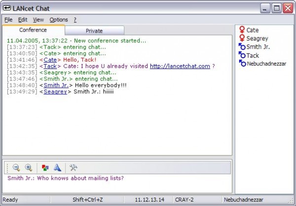 LANcet Chat – программа для обмена мгновенными текстовыми сообщениями в пределах локальной сети. Работа этого чата происходит в реальном времени по принципу конференции.
