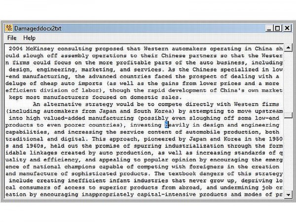 Damaged DOCX2TXT – бесплатная, но тем не менее отлично справляющаяся со свими обязанностями программа для восстановления поврежденных doc файлов. Все что от вас требуется, это указать необходимый файл и подождать пока программа не восстановит все что возможно и не сохранит уцелевшие данные в txt файле.