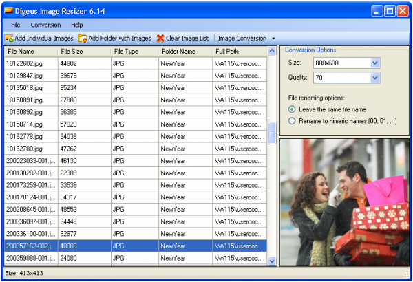 Digeus Image Resizer - это идеальный инструмент для тех, кто хранить десятки цифровых фотографий и изображений на компьютере и при этом хотят изменить, сжать, конвертировать, создавать копии, импортировать и организовывать фотографии.