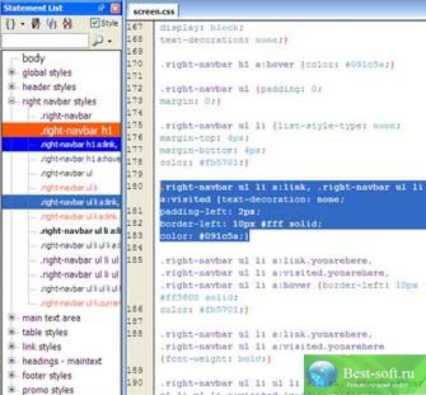 Визуальный редактор CSS. Style Master содержит все необходимые инструменты для разработки каскадных стилей таблиц. Включает в себя коллекцию шаблонов готовых стилей. Как известно, реализация CSS в различных браузерах неодинакова, Style Master имеет функцию валидации, позволяя вам быть уверенными, что CSS-код отображается одинаково во всех версиях браузеров.
