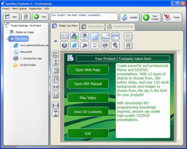 AutoRun Typhoon – программа для простого и быстрого создания меню автозапуска для CD/DVD дисков. Весь процесс создания меню выполнен в формате диалога, что делает его крайне простым.