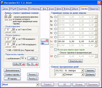 Программа, 'заточенная' на учет трафика, времени и денег при работе в Интернете с различными типами соединений по протоколу TCP/IP (Dial-Up, GPRS, ADSL, локальная сеть LAN и пр.) с очень широкими возможностями настройки линейки счётчиков 'под себя': размер; горизонтальная и вертикальная ориентация; цвет; шрифты; видимость только нужных счётчиков, пунктов меню и т.д. Обработка почти всего многообразия существующих сегодня тарифных планов (ден. ед. за 1 час работы и за 1 МБ трафика, лимиты, IP-тарифы, интернет-карты и пр.) В заданные пользователем дни и промежутки времени становятся активными нужные тарифные планы. Работа с несколькими соединениями (провайдерами), для каждого свои настройки и табличный файл отчёта с подробным описанием каждого сеанса связи, графическими диаграммами (деньги, время, трафик) и возможностью анализа отчёта по заданным критериям (дни недели и промежутки времени). Экспорт таблицы отчёта соединения в Microsoft Excel. Имеется сетевой монитор, где видны все IP-адреса, с которыми установлено соединение, запись этой информации в файл. Синхронизация системного времени компьютера с публичными NTP-серверами точного времени в Интернете. Графики скорости приёма и передачи с возможностью их сохранения в файле; пинг.
