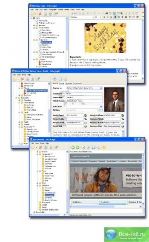 Программа хранит все данные в виде дерева и позволяет легко управлять ими, получая быстрый доступ к любой информации. Он хорош на работе и дома, так как умеет работать с несколькими базами данных из разных мест: поместив программу на flash-диск, вы сможете получить доступ к информации с любого компьютера. О безопасности данных не стоит волноваться, так как органайзер позволяет защищать любые записи встроенным паролем. Дистрибутив содержит множество крылатых выражений и поговорок, которые будут показываться при запуске - и можно добавить свои собственные изыски. Демонстрационная база поможет быстрее разобраться с программой. Бесплатная версия работает по полной в течение 30 дней, а потом "вырубается". Автор оценил продукт в 500 рэ, но для бедных студентов, переводчиков, тестеров есть возможность получить авторский ключ - за помощь, замечания и советы, напишите и договоритесь. Части (разделы) баз легко можно сохранить в основных форматах (doc, html, xml, txt и тд), а сами базы можно сжимать и архивировать куда угодно. Лично я в Сети пока что ничего лучшего не нашел, даже Mars Notebook проигрывает по ряду важных позиций...