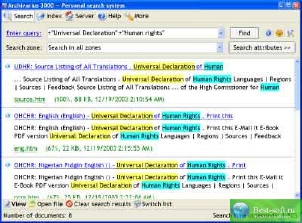 Программа Архивариус – это поиск документов и почтовых сообщений в Вашем компьютере, в локальной сети и в съёмных дисках (CD, DVD и др.). Поиск производится по содержимому документов, с учётом морфологии (рус, укр, бел и др.). Полностью поддерживается уникод.
