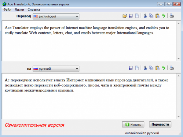 Ace Translator – крошечная программа для перевода текста с различных языков. Подойдет, если вам нужно, например, перевести веб-стрницу или сообщение из Интернет-мессенджера.