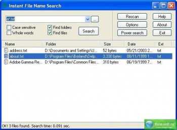 Instant File Name Search - бесплатная программа для моментального поиска файлов и папок на вашем компьютере или в локальной сети. Требуется лишь указать часть имени файла или маску (*.xls, *mult*.swf, pic???.jpg) и нажать на кнопку. Возможен и более сложный поиск с использованием логических операторов (И, ИЛИ, НЕ). Программа очень проста в использовании, не требует от пользователя специальной подготовки и будет полезна как в офисе так и дома.